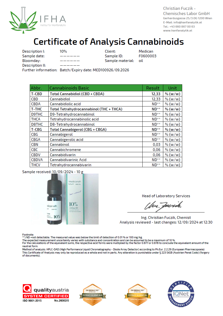 Uleiul CBD Full Spectrum Medicanah 10% este extras din canepa industriala certificata, produs in SUA printr-un proces patentat care elimina complet THC-ul. Contine 1000mg CBD in sticla de 10ml (aprox. 350 picaturi, 1 picatura = 3mg CBD), cu pipeta gradata la 0.25ml si sistem de siguranta pentru copii. Sticla biofotonică de grad farmaceutic protejeaza compusii activi de lumina, asigurand puritate maxima - testat in laborator, fara pesticide, metale grele sau impuritati.