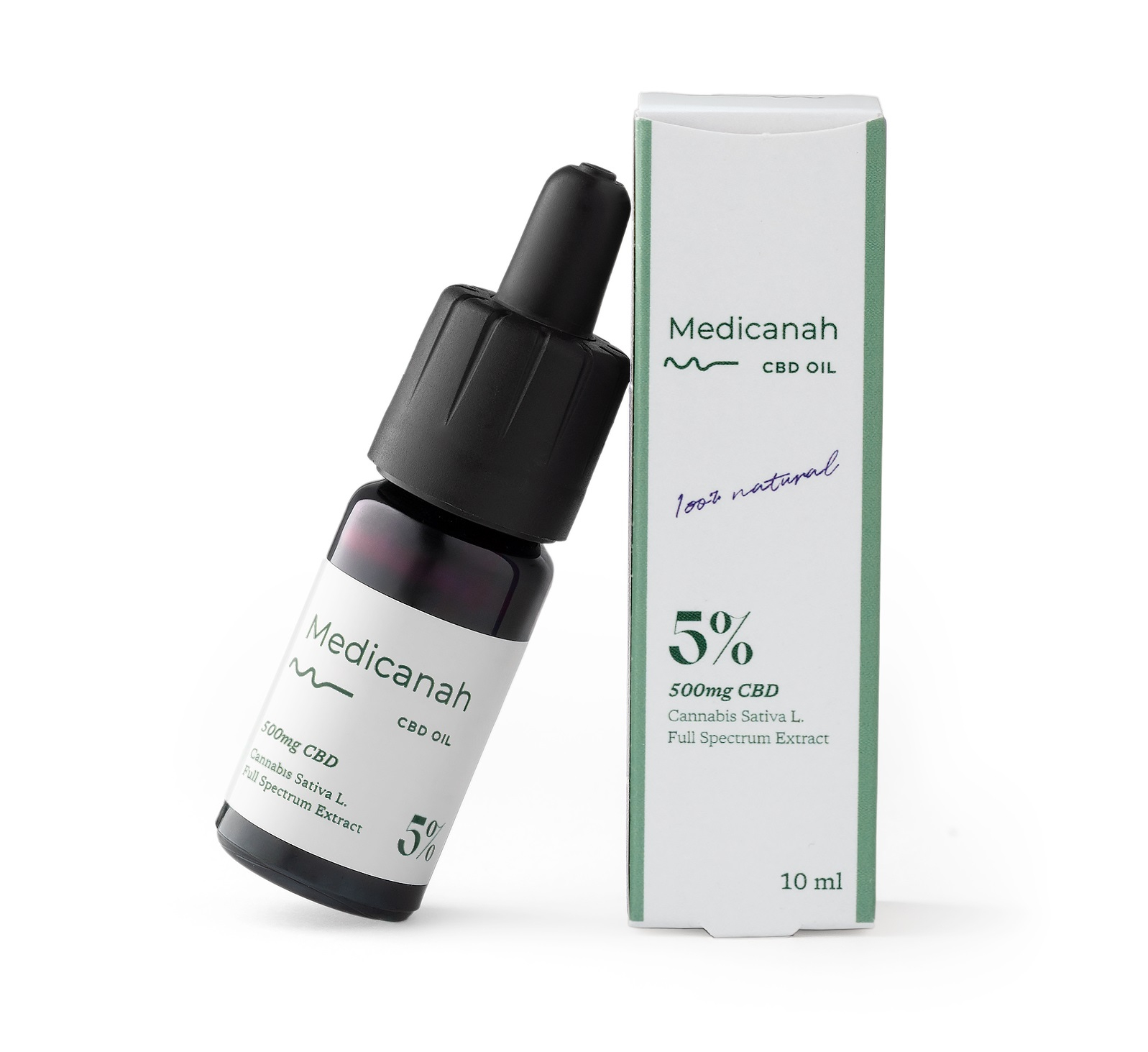 Uleiul CBD Full Spectrum Medicanah 5% este extras din canepa industriala certificata, produs in SUA printr-un proces patentat care elimina complet THC-ul. Contine 500mg CBD in sticla de 10ml (aprox. 350 picaturi, 1 picatura = 1.5mg CBD), cu pipeta gradata la 0.25ml si sistem de siguranta pentru copii. Sticla biofotonică de grad farmaceutic protejeaza compusii activi de lumina, asigurand puritate maxima - testat in laborator, fara pesticide, metale grele sau impuritati.